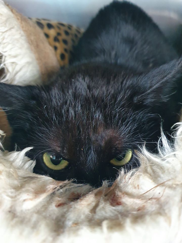 Ferdi war total wild, als er uns in die Falle ging. Er fauchte, knurrte, spuckte und hätte uns am liebsten in Stücke gerissen. Bei uns hat er auch noch Angst, zeigt aber keinerlei Aggression mehr. Er ist wahrscheinlich froh, seine furchtbaren Schmerzen los zu sein.