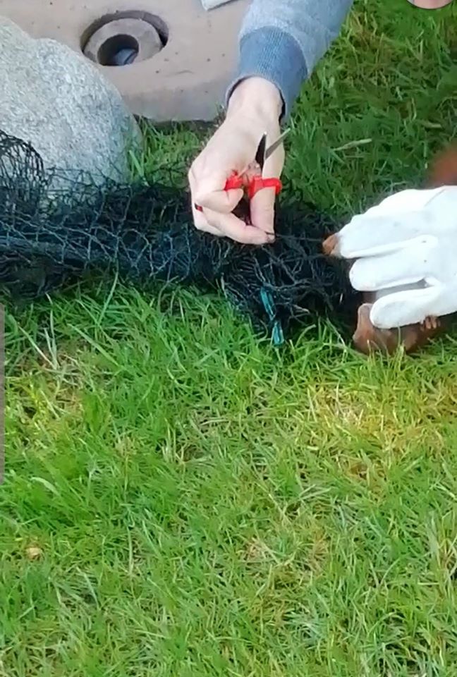 Heute wurden wir zu einem „verunglückten“ Eichhörnchen gerufen. Es hatte sich in voller Panik in einem Teichnetz verheddert und sich fast stranguliert.