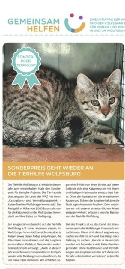 Wir möchten den Preis in diesem Jahr für die vielen Kaufhof- und Innenstadtkätzchen von Wolfsburg verwenden, die wir zu versorgen haben. Wer eines unserer Innenstadtkätzchen adoptieren möchte, meldet sich gerne bei uns.