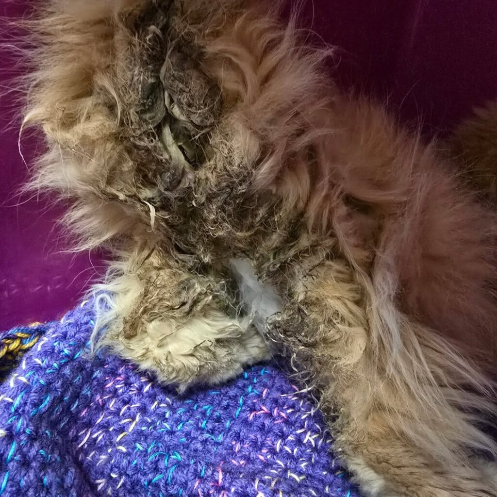 Komplett verfilzt und abgemagert.