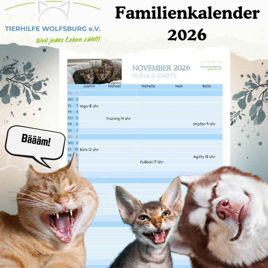 Wir freuen uns riesig, euch den Familienkalender 2026 der Tierhilfe Wolfsburg e.V. präsentieren zu dürfen!