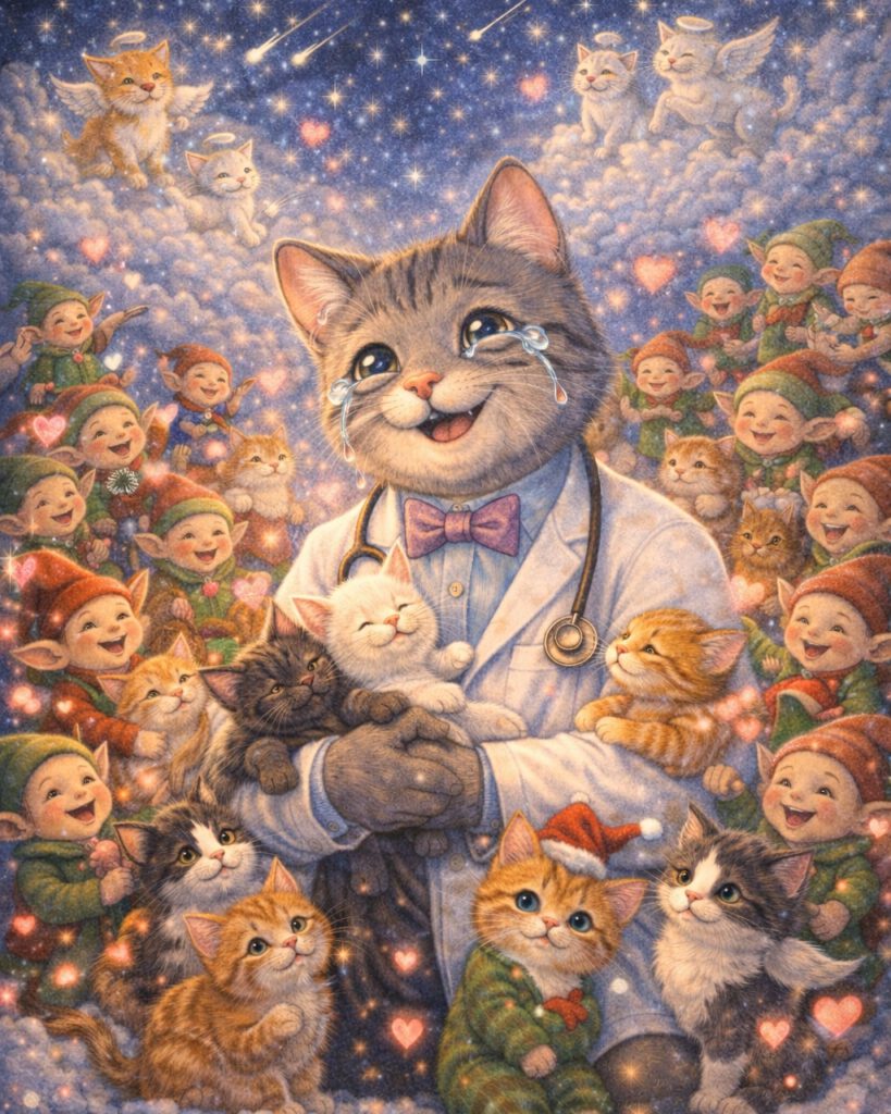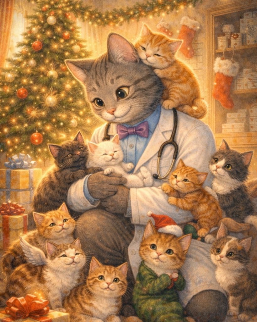 Er steht in der Tür der Weihnachtsklinik und legt die Pfote aufs Herz. Er sagt leise: