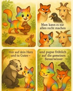 Hier aus gegebenem Anlass eine Gute-Nacht-Geschichte -Minka, die bunte Katze- Im kleinen Walddorf lebte Minka, eine kleine Katze mit Fell...