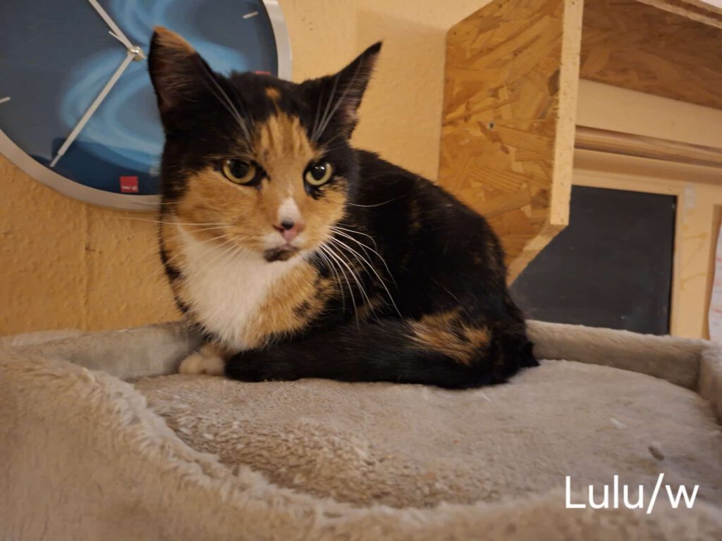 Elsa, dreifarbig, ca. 3 Jahre alt, hat leider Probleme mit ihrer rechten Schulter (Arthrose). Von daher benötigt sie alle 4 Wochen eine Schmerzspritze.